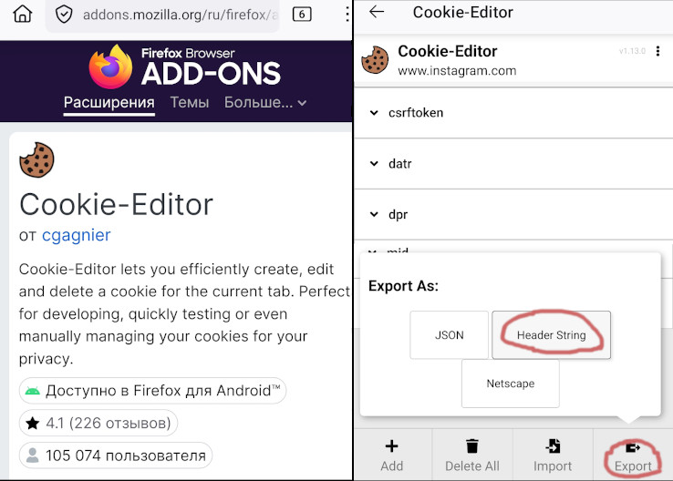 4. Нажать "..." - расширения - "Cookie-Editor" - "Export" - "Header String" и вставить в поле Токен выше, выбрать галочку "Использовать свой токен", нажать "Сохранить"